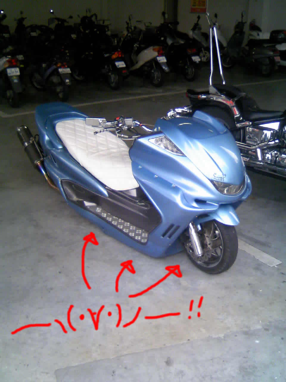 で、先日、横浜市内の某パチンコ屋の駐輪場で超プロ仕様のバイクを発見しましたww。その時のケータイ画像です。